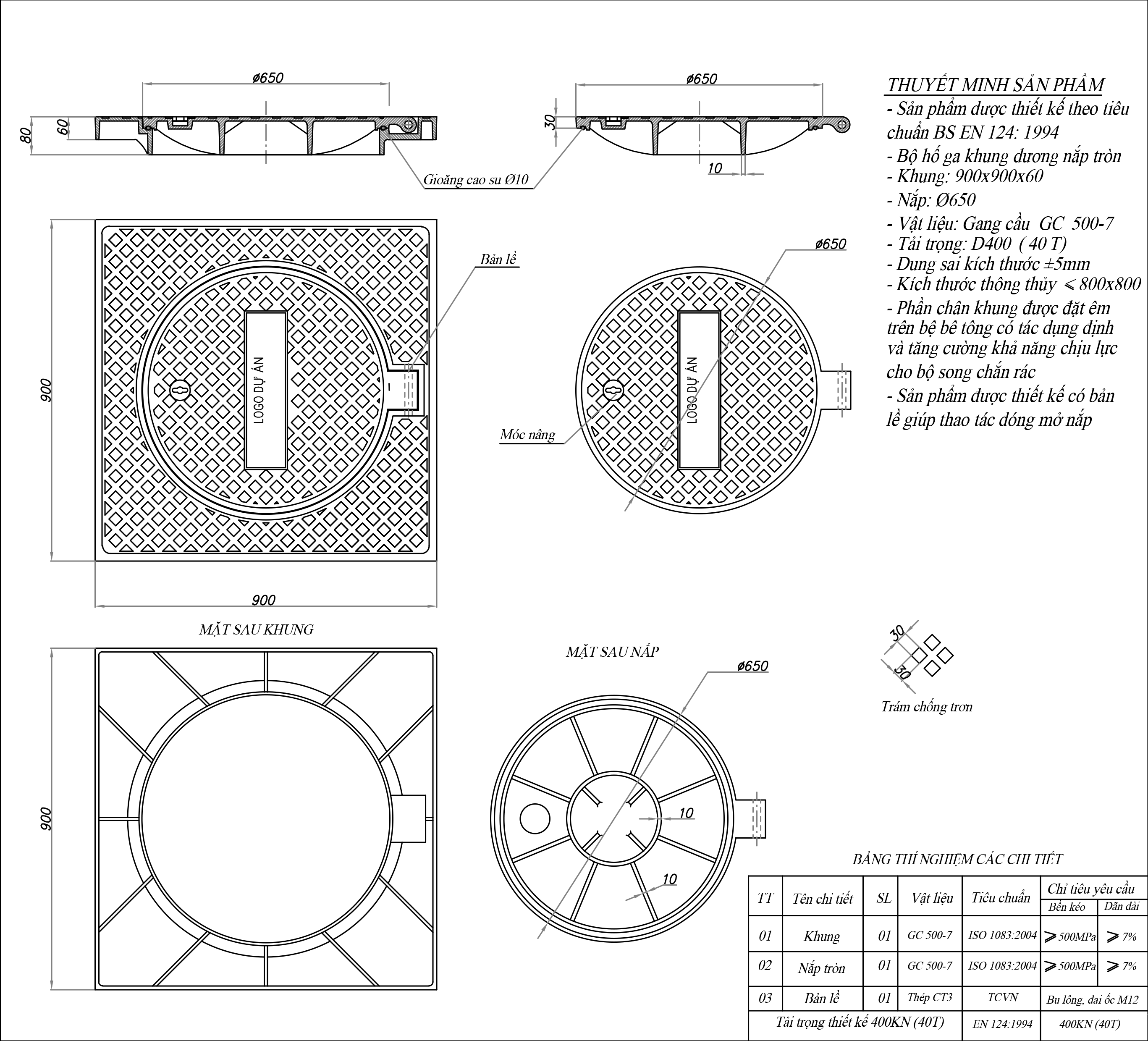 | Tải trọng thiết kế 40 tấn (400KN) | BS EN124:1994 | >= 400KN | ||||